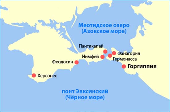 На побережье Черного моря уже в VII в. до н.э. греки основали ряд городов-колоний, расцвет которых пришелся на V-IV века до н.э. В ходе колонизации было основано несколько десятков полисов и посёлков, среди которых самыми крупными были: Боспор Киммерийский, Ольвия, Херсонес, Фанагория, Горгиппия, Танаис, Гермонасса.