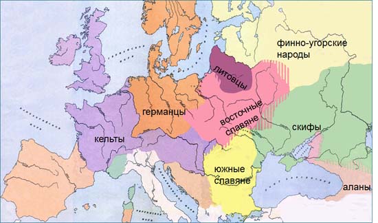 Соседями славян на северо-востоке являлись финно-угорские народы (меря, мордва, са-амы, марийцы и др.). На юго-востоке они граничили со скифами и аланами (рис. 3).