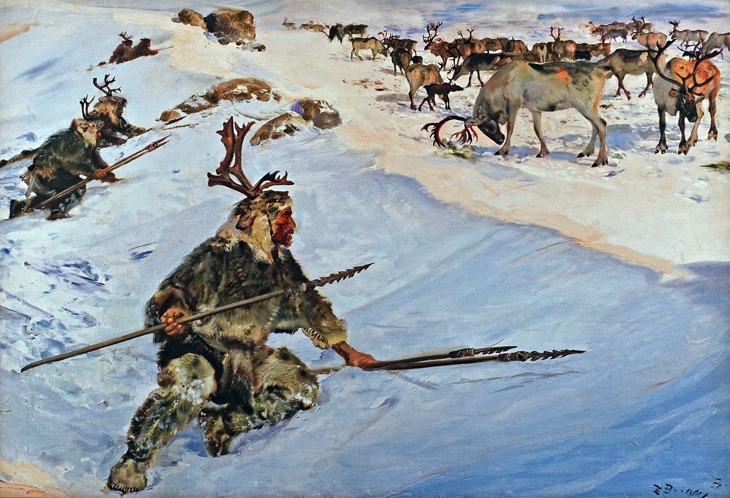 Климат нашей планеты не постоянен и с определенным промежутком времени относительно комфортный период (потепление) сменяется ледниковым (похолодание). Это связано с особенностями движения планеты по орбите вокруг Солнца. Около 100 тыс. лет назад климат планеты стал очередной раз меняться в сторону похолодания. Температура столетие за столетием понижалась. Выпадавший в зимние месяцы снег уже не успевал растаять и превращался в многолетний лёд, еще больше усиливая внешний холод. Мощный ледниковый щит покрыл северное полушарие. ВЗдесь на долгие тысячи лет наступил ледниковый период. Местами толщина многолетнего льда и снега достигала нескольких километров в высоту. Менялся облик планеты, исчезала растительность и целые виды животных. Выживали и приспосабливались к суровым условиям лишь те виды, которые могли сохранять тепло и были непривередливы к пище – мамонты, шерстистые носороги, северные олени, медведи, волки и т.п. Немногочисленное ещё человечество оказалось перед выбором: адаптироваться или погибнуть. И человек с честью вышел из этого сурового испытания. Накопленный к этому времени опыт изготовления орудий и преобразования внешней среды навсегда изменил судьбу людей. ![]() На местах стоянок первобытного человека в это время широко распространяются разнообразные изделия из кости, в том числе иглы из рыбьих костей, что свидетельствует о появлении шитой одежды из шкур животных. Если в конце раннего палеолита люди использовали примитивные жилища – в пещерах и гротах, то теперь люди уже строили целые поселки из нескольких жилищ на основе костяного каркаса, покрытого шкурами животных. Основным занятием в этот сложный период стала охота, в приемах и способах которой человек достиг поразительного мастерства и изобретательности. Важнейшим открытием первобытного человека стало использование огня для обогрева и приготовления пищи, отпугивания диких зверей и освещения. Регулярное употребление в пищу термически обработанной пищи изменило в лучшую сторону метаболизм организма человека. Позднее человек научился добывать огонь трением или высеканием искр из камня, а также сохранять и переносить на большие расстояния. В эту эпоху происходит заселение людьми большей части территории планеты. Ледниковый период закончился около 15 тысяч лет назад. Человек научился приспосабливаться к природе не биологически, а социально. Эти достижения позволили людям значительно расширить пределы обитаемой части земного шара.