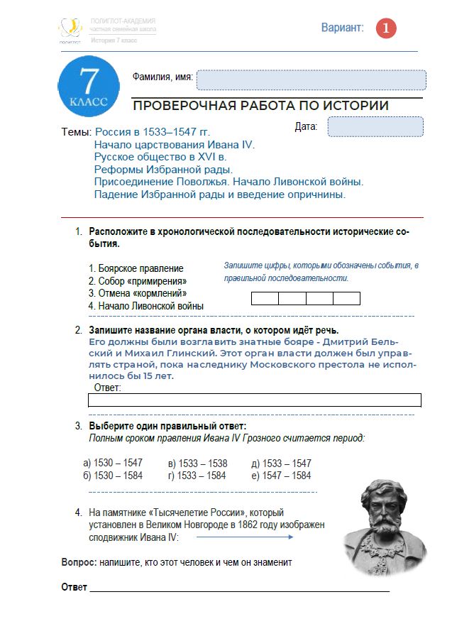 4.1. Мир и Россия в XIV-XV вв. 4.2. Россия в 1533–1547 гг. 4.3. Начало царствования Ивана IV. 4.4. Русское общество в XVI в. 4.5. Военные реформы Ивана IV и Избранной рад 4.6. Наследники Золотой Орды в середине XVI в. 4.7. Присоединение Поволжья. Начало Ливонской войны. 4.8. Ликвидация Избранной рады и введение опричнины. 4.9. Россия при царе Фёдоре Ивановиче. 4.11. Развитие культуры в XVI в. 4.12. Духовная жизнь общества в XVI в. 4.13. Обобщающее повторение «Россия в XVI в.»