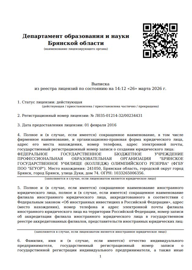 Выписка из реестра лицензий по состоянию на 14:12 «26» марта 2026 г. Регистрационный номер лицензии: № Л035-01214-32/00234431 от 24.02.2025 г.