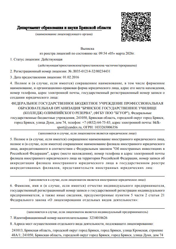 Федеральное государственное бюджетное учреждение профессиональная образовательная организация "Брянское государственное училище (колледж) олимпийского резерва"