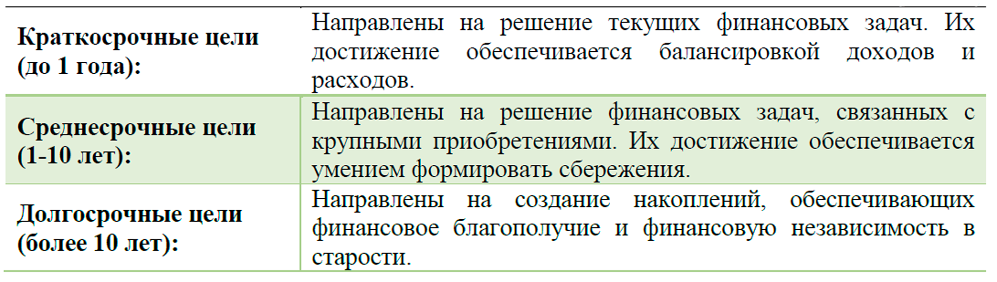 Цель финансового планирования обеспечение финансового благополучия (личного и семейного) и финансовой независимости в течение всей жизни. В зависимости от горизонтов планирования выделяют: