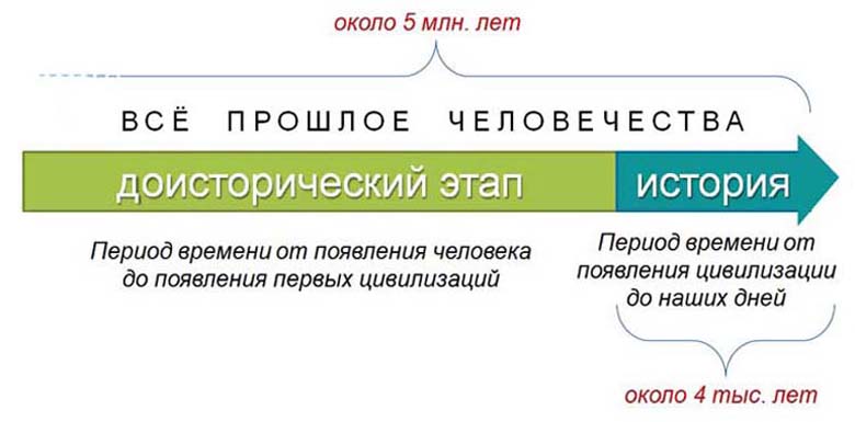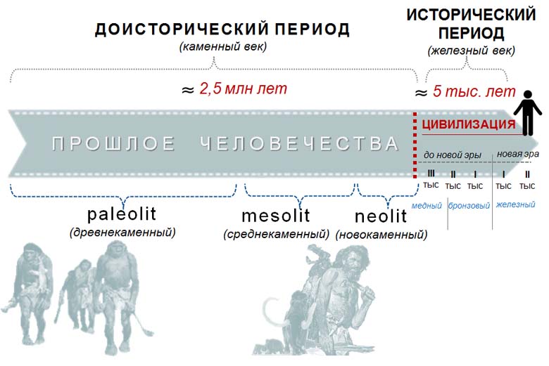 Весь период прошлого человечества принято разделять на два неравномерных периода. Первый – наиболее большой – называют доисторическим (или предысторией), второй - историческим (цивилизацией).