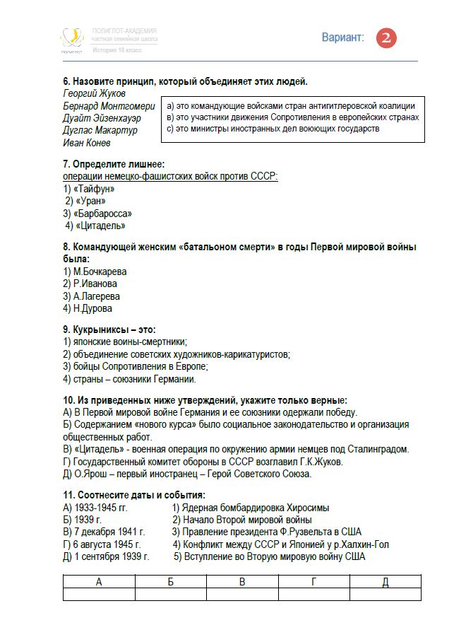 6.1. Начало Великой Отечественной войны. 6.2. Битва за Москву и блокада Ленинграда. 6.3. Фронт за линией фронта. 6.4. Единство фронта и тыла. 6.5. Сталинградская битва. Начало коренного перелома в ходе войны. 6.6. Курская битва. Завершение коренного перелома в ходе войны. 6.7. «Десять сталинских ударов» и изгнание врага с территории СССР. 6.8. Наука и культура в годы войны. 6.9. Освобождение народов Европы. Победа СССР в Великой Отечественной войне. 6.10. Окончание Второй Мировой войны. Итоги и уроки. 6.11. Итоговое занятие.
