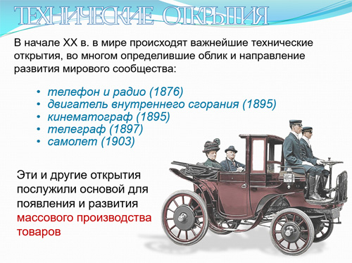 Жизнь человека на протяжении тысячелетий менялась очень медленно. В ХХ в. технический прогресс неузнаваемо преобразил жизнь людей. Переход к индустриальному обществу сопровождался разрушением традиционного уклада (сельское хозяйство и традиции). Индустриализация меняла саму логику мышления людей и открывала путь нововведениям — общественным, научным, техническим. Научно-техническая революция произошла на рубеже XIX—ХХ вв. В 1895 г. русский физик Александр Попов изобрел радио. В 1903 г. братья Райт подняли в небо первый самолёт. В 1903 г. Константином Циолковским опубликованы труды, в которых обосновывались возможности космических полётов. В начале XX века появились первые автомобили, первые кинофильмы и т. д. Быстрый технический прогресс порождал у многих неоправданные надежды на скорое достижение всеобщего благоденствия. К тому же плодами технического прогресса в те времена могли пользоваться только представители обеспеченных слоёв населения. Остальным жителям планеты индустриализация и интенсивная эксплуатация приносили прежде всего страдания и лишения. В авангарде технического прогресса шли и изобретатели средств уничтожения. Были разработаны и испытаны первые пулемёты, бронеавтомобили, подводные лодки.
