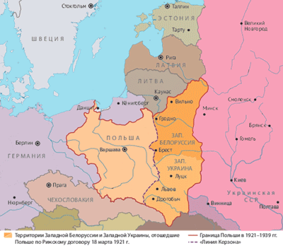 Польско-советская война 1920 г. закончилась поражением Красной Армии под Варшавой, в результате чего Польша оккупировала территорию Западной Украины и Западной Белоруссии. При помощи Германии в Эстонии, Латвии и Литве большевики так же были разгромлены. В октябре 1918 г. началась демократическая революция в Австро-Венгрии. Бывшая Австро-Венгерская империя превратилась в небольшую германоязычнуюреспублику - Австрию. В 1919 г. полностью самостоятельными государствами стали Венгрияи Чехословакия.. Освободившиеся от австро-венгерского господства южнославянские народы объединились в Югославию.