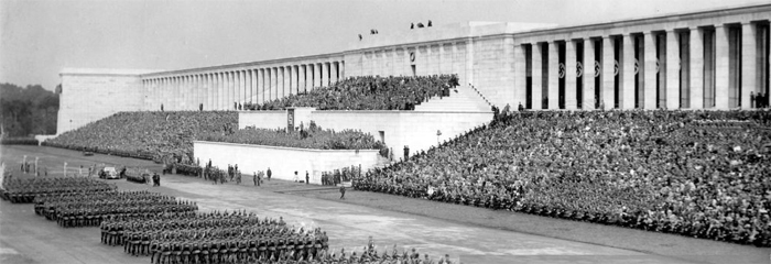Фашистские режимы широко использовали культуру для распространения своих идей. Сфера культуры попала под полный контроль государства. Часть деятелей культуры оказалась в эмиграции, другие стали сотрудничать с режимом. В гитлеровской Германии Министерство народного просвещения и пропаганды во главе с Йозефом Геббельсом пощрялась проза, вошедшая в историю немецкой литературы под названием «Кровь и почва», романы и повести на исторические темы. Немецкое киноискусство было полностью поставлено под контроль государства. Документальные фильмы «Победа веры» (1933), «Триумф воли» (1935) воспевали Гитлера, идеи нацизма. В фильме «Олимпия» (1936—1938) (об Олимпийских играх в Берлине) просматривалось стремление отразить становление «нового общества» и порождённого им «сверхчеловека». ![]() Третий рейх выдвинул новых архитекторов, ставших основателями особого «имперского стиля». Одним из примеров этой архитектуры служит комплекс сооружений Имперского комплекса съездов нацистской партии в Нюрнберге. В Италии Муссолини провозгласил лозунг возрождения величия Римской империи. В стремлении подражать античной архитектуре создавались обширные проспекты и парадные площади для проведения шествий и манифестаций. Официальными направлениями архитектуры стали неоклассицизм и символизм.