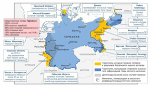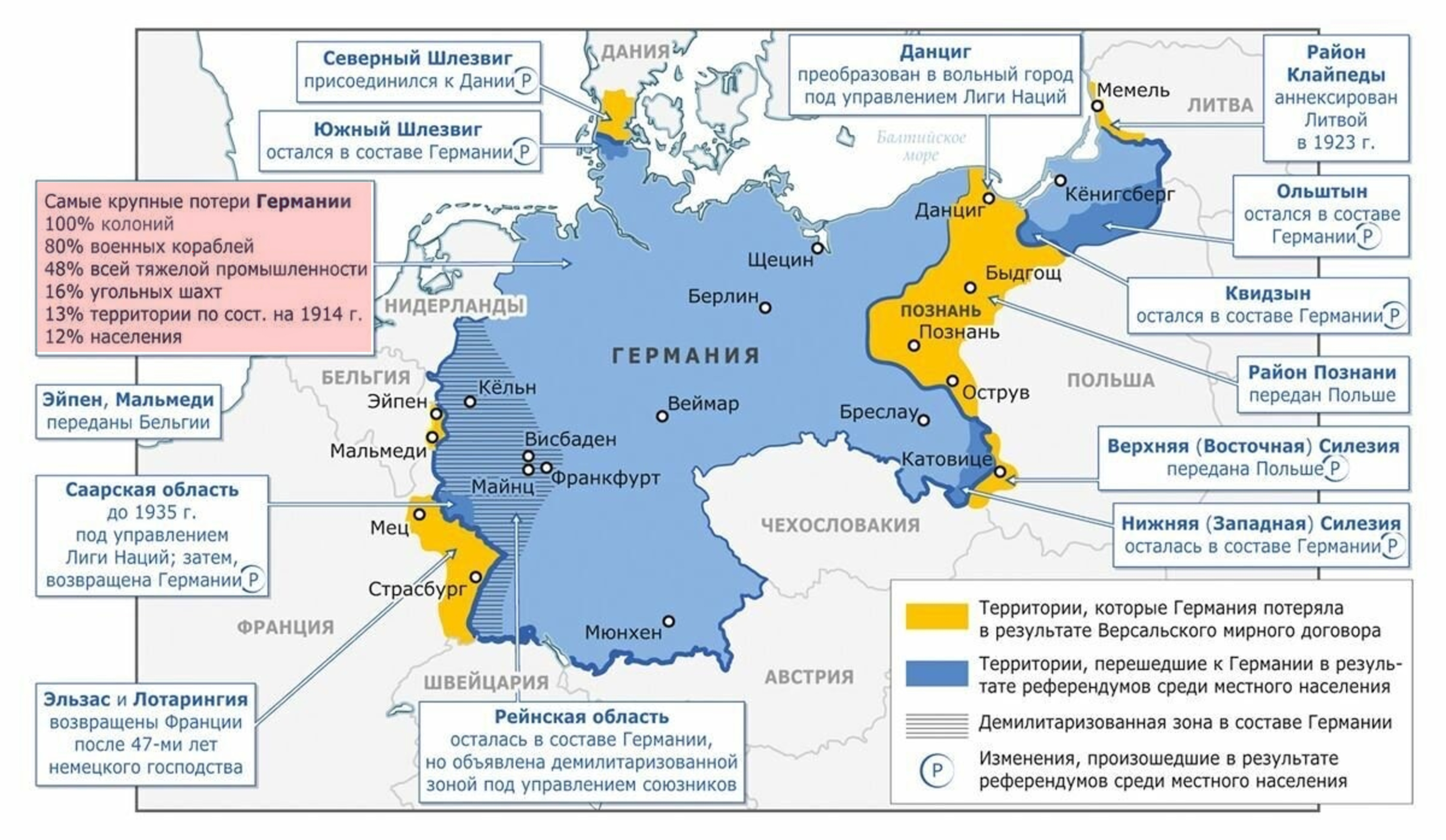 От Германии в пользу Франции отторгались Эльзас и Лотарингия, небольшие территории отходили Бельгии и Дании. Часть земель Германии передавалась вновь образованной Польше, которая получала выход к Балтийскому морю. Германские колонии присвоили себе Великобритания, Франция, Бельгия и Япония. Наряду с бывшими османскими провинциями на Ближнем Востоке они объявлялись управляемыми извне (мандатными) территориями. Лига Наций от лица международного сообщества передавала их на время под управление европейцам (такая завуалированная форма грабежа). Германское владение в Китае получала Япония. Это вызвало возмущение в Китае, и китайская делегация отказалась подписывать договор. Размер германских репараций составил 132 млрд золотых марок, более половины которых доставались Франции. Германии запрещалось иметь армию свыше 100 тыс. человек, военно-морской флот, танки, авиацию и подводные лодки. Почти все независимые государства вступили в Лигу Наций, учреждённую в 1919 г. Её устав предусматривал отказ от войны и коллективное наказание агрессора. Ежегодно созывалась Ассамблея Лиги Наций, которая обсуждала все международные вопросы. Однако большинство народов в Лигу не были приняты, так как находились в колониальной зависимости. По сути, Лига Наций отстаивала интересы только двух стран — Великобритании и Франции. Внутри США идеи Вильсона так и не получили поддержки. Согласно доктрине Монро, американцы не желали заниматься европейскими делами, и США в Лигу Наций так и не вошли.