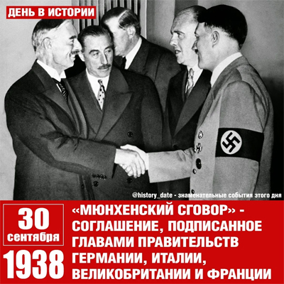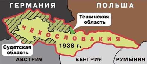 В 1938 г., угрожая войной, Гитлер потребовал от Чехословакии передать Германии Судетскую область, где значительную часть населения составляли этнические немцы. Возник так называемый Судетский кризис, развязка которого стала прологом ко Второй мировой войне. Правительства Франция и Великобритании считали, что их армии не готовы воевать с Германией в 1938 г., поэтому решили договориться с Гитлером о передаче Германии требуемых территорий. Лидеры Англии и Франции при посредничестве Муссолини договорились о личной встрече с Гитлером в Мюнхене. Главным «архитектором» Мюнхенского соглашения был премьер-министр Великоброитании Невилл Чемберлен. Чехословакиеей было решено пожертвовать, чтобы откупиться от германских требований. ![]() Администрация США поддержала Мюнхенский сговор. Советский Союз предложил немедленно созвать Совет Лиги Наций, созвать совещание представителей генеральных штабов Франции, Чехословакии и СССР для обсуждения возможных совместных действий. Однако все инициативы, выдвинутые Москвой, были проигнорированы. Состоявшаяся 29—30 сентября 1938 г. Мюнхенская конференция с участием Гитлера, Даладье, Чемберлена и Муссолини свелась к решению: принудить Чехословакию передать Германии Судетскую область. При этом Чехословакия теряла четверть населения, около половины тяжёлой промышленности и мощные укрепления на границе с Германией. Польша приглашения принять участие в Мюнхенской конференции не получила. Тем не менее она стала соучастником гитлеровской Германии и воспользовалась ситуацией, чтобы отторгнуть от Чехословакии Заользье (Тешинская Силезия). Польские войска заняли Тешинскую Силезию. Мюнхенский сговор стал закономерным итогом политики умиротворения, которую проводила Великобритания с момента прихода нацистов к власти в Германии. Последствия Мюнхенского сговора были поистине катастрофическими: оккупировав сначала Судетскую обл., а весной 1939 г. всю Чехословакию, нацисты получили промышленный потенциал одной из наиболее развитых стран Европы, что позволило им резко увеличить производство вооружений. Решение «чехословацкого вопроса» укрепило уверенность Гитлера в том, что Англия и Франция не будут воевать и за другие страны Европы, с которыми они были связаны союзными договорами и которым обещали поддержку. Теперь дата начала большой европейской войны полностью зависела от Германии, строившей амбициозные планы установления мирового господства.