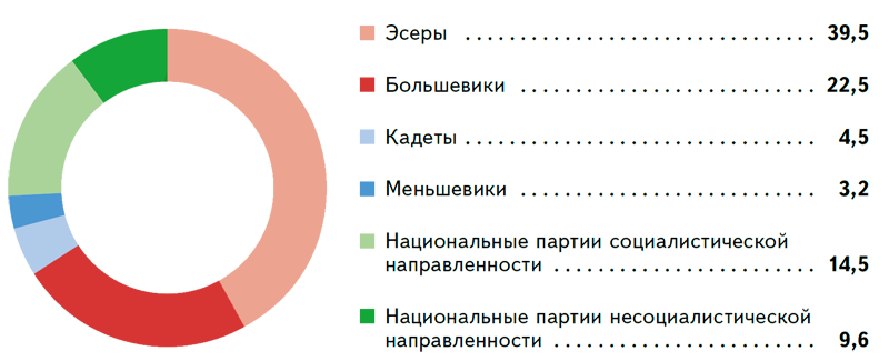 Идея Учредительного собрания была очень популярна среди всех партий и организаций после свержения монархии в феврале 1917 г. Выборы прошли в ноябре — в срок, назначенный ещё Временным правительством. Итоги выборов были предсказуемы: большинство крестьян выбирали своими делегатами представителей партии эсеров, около 22% голосов получили большевики. ![]()