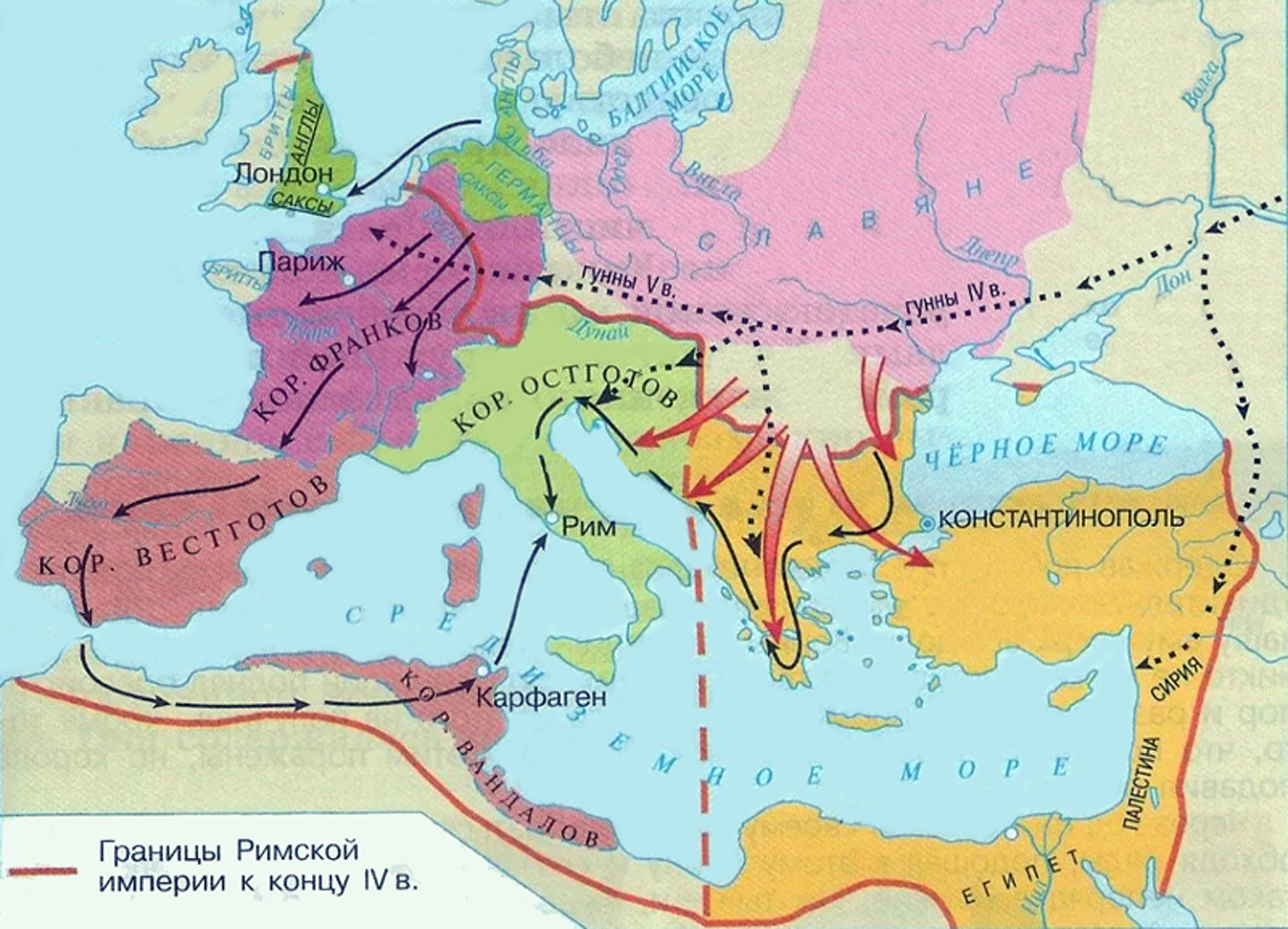 Гунны, жившие к северо-западу от Китая, начали перемещаться на запад, тесня и увлекая за собой другие племена. В IV в. гунны дошли до Причерноморья. Началось Великое переселение народов. В него влились многочисленные племена Евразии, в том числе германцы и славяне.