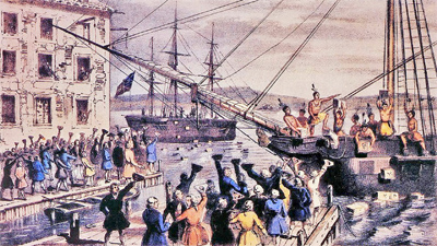 Победа над Францией в Семилетней войне дорого обошлась Великобритании. Государственный долг страны вырос почти в два раза, и правительству для пополнения казны приходилось изыскивать всё новые источники. Поэтому оно решило распространить систему налогообложения на колонии. До этого момента колонисты не платили налоги в английскую казну. В 1763 г. король запретил поселенцам осваивать земли западнее горного хребта Аппалачи. Колонистам этот запрет очень не понравился. В 1765 г. английский Парламент издаёт закон о «гербовом сборе» — налоге на все юридические документы. Колонисты возмутились, заявив, что не будут платить этот налог, поскольку они не выбирают депутатов британского парламента и те им не указ. Движение протеста охватило все колонии. Основным сребством противостояния стал бойкот британских товаров. Доходы торговцев резко упали. Английское правительство в Лондоне было вынуждено отменить «гербовый сбор». Однако колонисты уже почувствовали свою силу. ![]() Принятые Лондоном законы о косвенных налогах на краску, бумагу, стекло и чай вызвали новую волну возмущения в колониях. В марте 1770 г. в Бостоне, столице колонии Массачусетс, толпа напала на английских солдат. В военных полетели камни, они в ответ стали стрелять. Пролилась кровь. Пытаясь разрядить ситуацию, британское правительство вывело войска из города и отменило принятые налоги, кроме налога на чай. Однако колонисты уже не хотели платить никаких налогов вообще. Делегаты 12 из 13 штатов собрались на Первый Континентальный конгресс и потребовали от правительства отменить все налоги. Неповиновение колоний достигло пика в декабре 1773 г. В Бостон пришли суда Ост-Индской компании с чаем. Бостонские активисты переоделись в индейцев, забрались на корабли и выбросили в море сотни ящиков с чаем. За этот акт открытого неповиновения, получивший название "Бостонское чаепитие", британское правительство закрыло порт в Бостоне, лишило Массачусетс самоуправления.