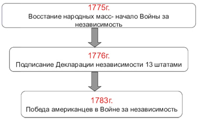 ![]() Поводом к войне колонистов и метрополии стали события 19 апреля 1775 г. Командующий английскими войсками отправил в г.Лексингтон отряд солдат, чтобы захватить склады оружия ополченцев. В результате столкновения с ополченцами произошла перестрелка, погибло несколько десятков человек. Так началась Война за независимость североамериканских колоний Англии 1775—1783 гг. В мае 1775 г. собирается Второй Континентальный конгресс представителей североамериканских колоний. Конгресс принимает решение о создании регулярной Континентальной армии, назначив главнокомандующим Дж. Вашингтона. ![]() Армии колонистов катастрофически не хватало оружия и опытных офицеров. Английская армия была малочисленна, но являлась профессиональной и хорошо вооруженной. Союзниками британцев стали индейцы, которые не питали любви к колонистам. В течение 1775-1776 гг. война шла достаточно хаотично. 4 июля 1776 г. Второй Континентальный конгресс издает «Декларацию о независимости». Главную роль в её разработке сыграл Томас Джефферсон. Соглано этого документа 13 североамериканских колоний объявлялись самостоятельными государствами (штатами), объединёнными в союз — Соединённые Штаты Америки. Объявлялось равенство всех людей и утверждались естественные права человека на жизнь, свободу и стремление к счастью. Поддержку колонистам олказала Франция, мечтавшая отомстить Великобритании за поражение в Семилетней войне. Через подставные фирмы французы поставляли боеприпасы и оружие. О вооруженном нейтралитете объявила Россия (что было выгодно колонистам). В марте 1778 г. Франция вступила в войну против Великобритании, чуть позже её примеру последовала Испания. Так в войне обозначился перелом. В 1781 г. в Париже начались мирные переговоры, хотя война ещё продолжалась. В 1783 г. был подписано мирное соглашение. Великобритания признала независимость США. ![]() По окончании войны за независимость США продолжали вести войну с индейцами. В 1795 г. подписан мирный договор, согласно которому индейцы признавали США и допускали белых поселенцев на свои земли.