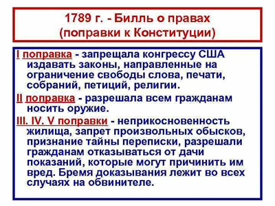 Высшим органом судебной власти становился Верховный суд. Кандидатуры судей предлагал президент и утверждал Сенат. Члены Верховного суда занимали свои посты пожизненно, отстранить их от должности, как и президента, можно было лишь путём особой процедуры — импичмента. В 1789 г. по новой Конституции первым президентом США был избран Джордж Вашингтон. В 1791 г. принял 10 поправок к Конституции, получивших название «Билль о правах». Поправки ограничивали властьфедерального правительства над гражданами.
