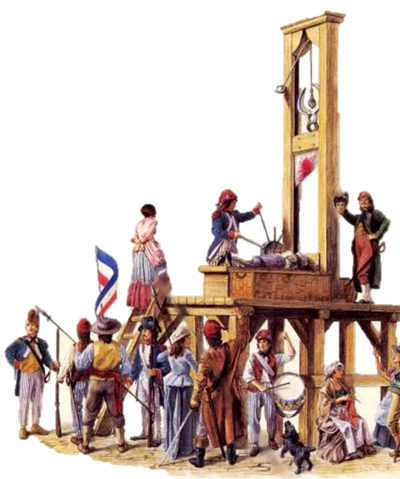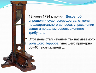 Осенью 1793 г. санкюлоты потребовали принять жёсткие меры в отношении контрреволюционеров. Террор стал политикой, направленной на устрашение противников революции (т.е. всех, кто был не согласен с якобинцам и монтаньярам). ![]() В сентябре 1793 г. был принят Закон о подозрительных. Арестовывать тех, кто не совершил ещё никакого преступления, но кажется подозрительным. Точное число лишённых свободы при терроре не известно до сих пор (до 500 тыс.). Погибло же, около 35—40 тыс. человек. Тысячами убивали местных жителей в регионе Вандея. После взятия Лиона, выступившего против Конвента, депутаты постановили разрушить город, уничтожить само его имя, а на развалинах поставить табличку: «Лион вёл войну против свободы — Лиона более не существует». Процветала шпиономания, то и дело раскрывались новые «заговоры», людей приучали видеть затаившихся врагов повсюду. Благодаря чрезвычайным мерам по организации обороны к концу 1793 г. Конвент подавил мятежи внутри страны и смог переломить ситуацию на фронтах. К началу 1794 г. опасность для республики была устранена, но террор лишь усиливался. Монтаньяры использовали его для расправы с политическими противниками. С июня 1794 г. отменялся допрос подсудимых, им не полагалось адвокатов, суд получал право не вызывать свидетелей. Ни один депутат Конвента не мог считать себя в безопасности. Страх толкнул их на заговор против Робеспьера. Так произошел т.н. "термидорьянский переворот" (9-е термидора II года Республики по новому французскому летоисчислению - 27 июля 1794 г.). 28 июля 1794 г. Робеспьер, Сен-Жюст и Кутон, были казнены. Свержение якобинской диктатуры привело к установлению нового режима — Директории. Была отменена политика «революционного террора», освобождены политические заключённые, и восстановлены некоторые гражданские свободы. ![]()