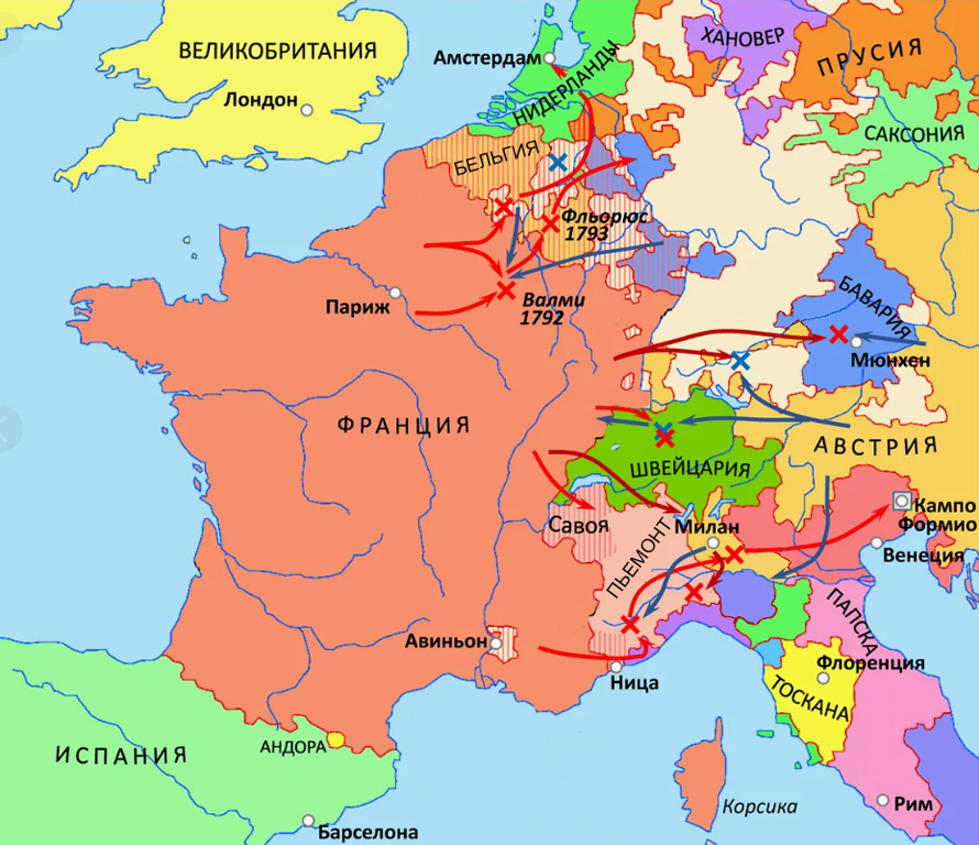 Осенью 1791 г. жирондисты во Франции развернула агитацию за войну под лозунгом «освобождения народов от гнёта тиранов». Опасаясь угроз Франции начать войну Австрия и Пруссия (забыв о соперничестве) заключили оборонительный союз. В 1792 г.французы объявили войну Австрии. На помощь ей пришли Пруссия и графство Пьемонт (одна из территорий Италии). Осенью 1792 г. Конвент издал декрет с обещанием помочь «всем народам, которые захотят обрести свободу». В 1793 г. Франция аннексировала Ниццу и Савойю (владение Пьемонта), а также Бельгию (владение австрийских Габсбургов). В 1794 г. Конвент объявил войну Великобритании, Голландии и Испании. В ответ эти страны создали Первую антифранцузскую коалицию. Во французской армии солдат убеждали в их принадлежности к «Великой нации», которая стоит выше всех остальных. Это наполняло их сердца гордостью и чувством превосходства, поддерживая высокий боевой дух. Слабостью же войск коалиции была разобщённость их действий - каждое стремилось к обеспечению своих собственных интересов. Так, Великобритания сосредоточила свои усилия на захвате французских колоний, Пруссия пыталась переложить бремя войны на плечи союзников. В результате к концу 1794 г. французские войска одерживают одну победу за другой. В 1795 г. коалиция распалась. В 1796 г. во французскую армию на границе Италии прибыл новыйкомандующий — молодой генерал Наполеон Бонапарт. Он одержал ряд блестящих побед над войсками Австрии и Пьемонта. ![]()