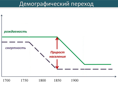 ![]() В XIX в. общество переживало количественные и качественные изменения. Ранее население росло очень медленно - по причине высокой смертности и невозможности накормить всех ввиду слабости экономики. Однако уже с XIX в. население стран Европы стало резко расти (1800 г.- 188 млн чел., в 1850 г. — 266 млн, к 1900 г. - 401 млн, а к 1914 г. — 468 млн человек). Причина такого роста в так называемом демографическом переходе: высокая рождаемость, низкая смертность. Почему снизилась смертность?