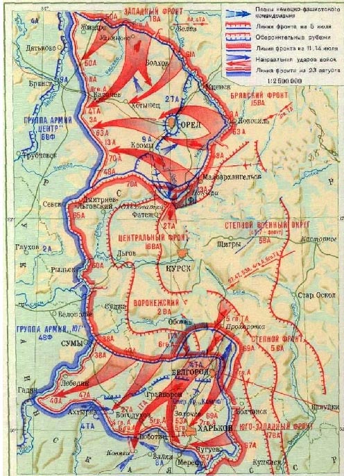 Центральный (северный участок Курского выступа, командующий – Константин Рокоссовский), Воронежский (южный участок – Николай Ватутин) и Степной фронт (резервный – Иван Конев).